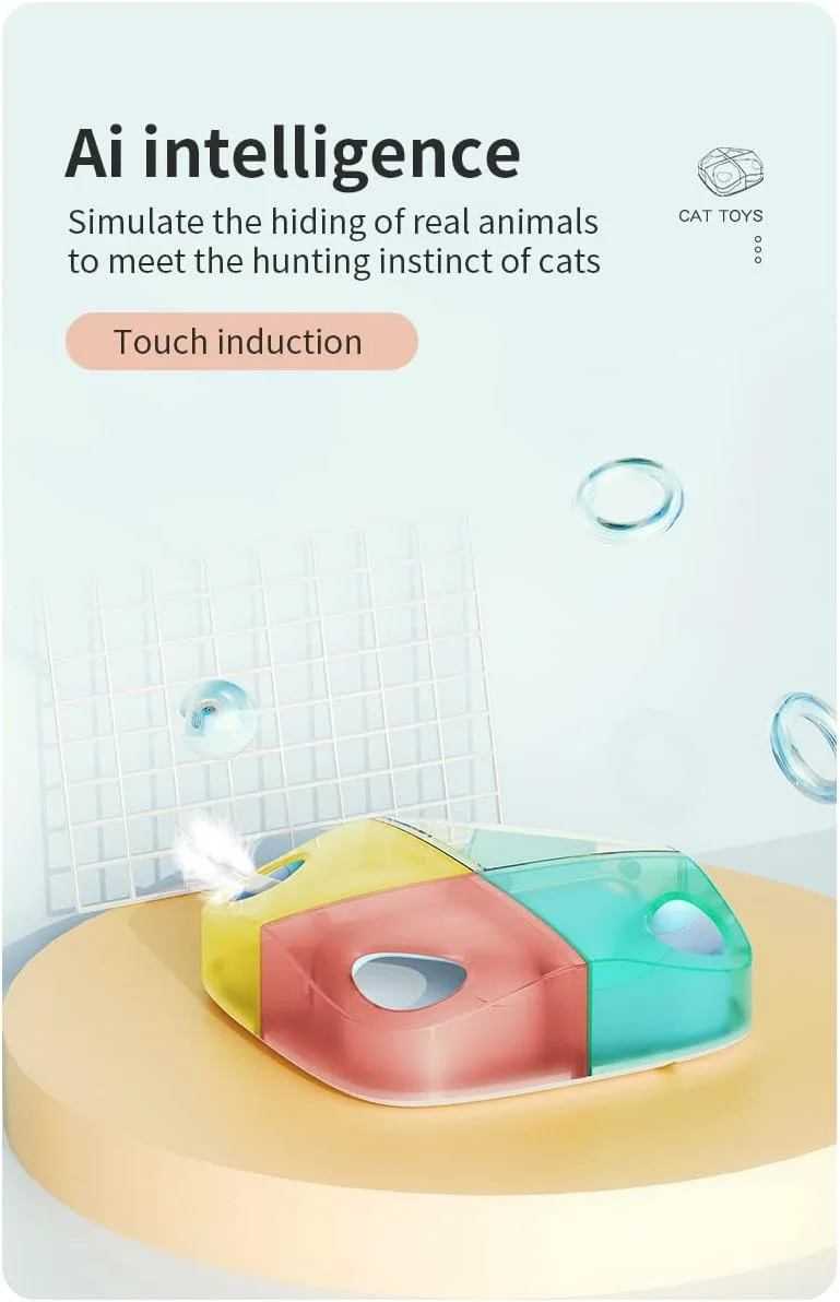 [4 Hole Whack-a-Mole] The colorful feather randomly pops out with the help of AI and hides within those 4 holes, which are present on the sides of the cat toy.The flat design will not let the cat's feet get stuck